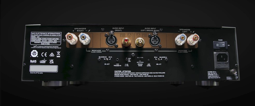 Besitzern eines NAD M33 Streaming-Vollverstärkers bietet sich zudem die Möglichkeit, ihre HiFi-Anlage zu einem System mit 2 x 700 Watt Dauerleistung auszubauen. Hier übernimmt dann der gebrückte M33 die Verstärkung des einen und die in Brückenschaltung laufende M23 die des anderen Stereo-Kanals.